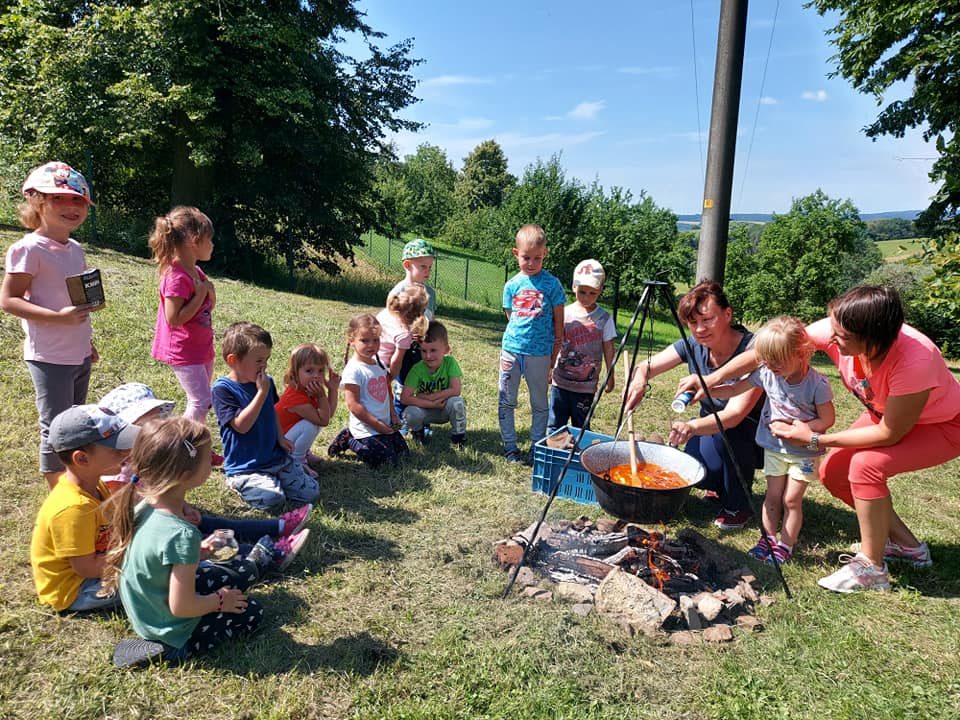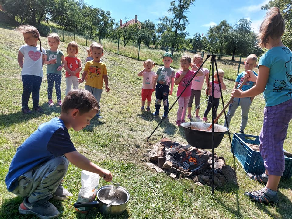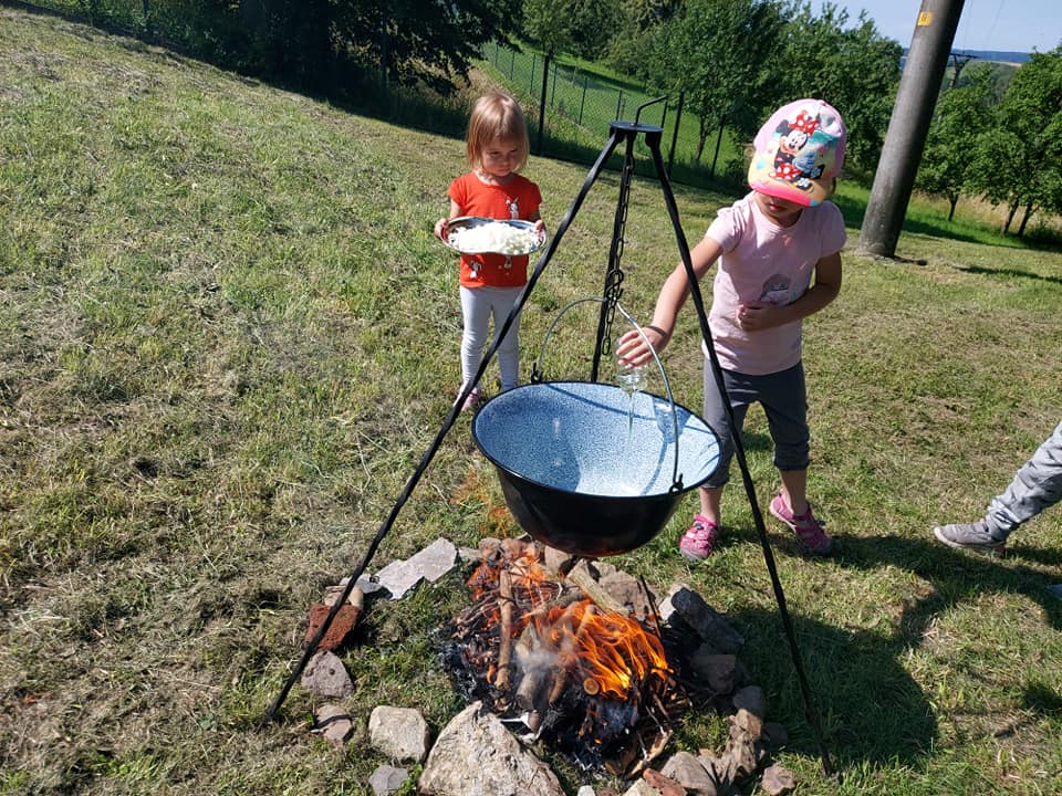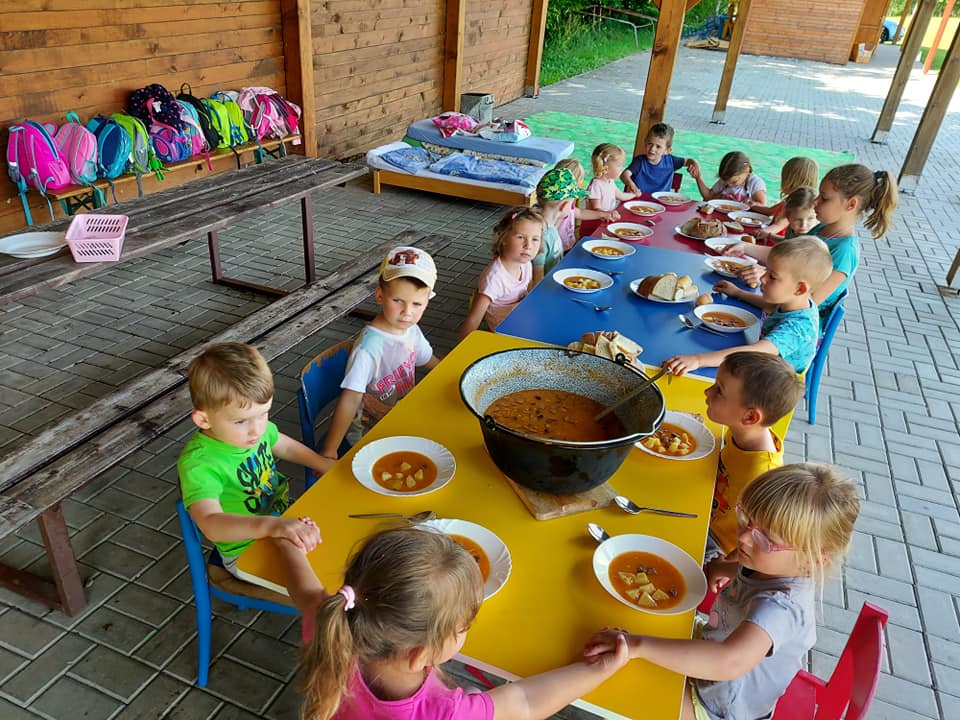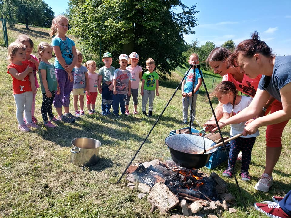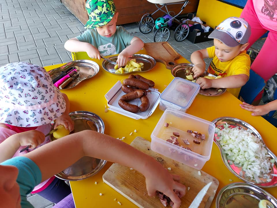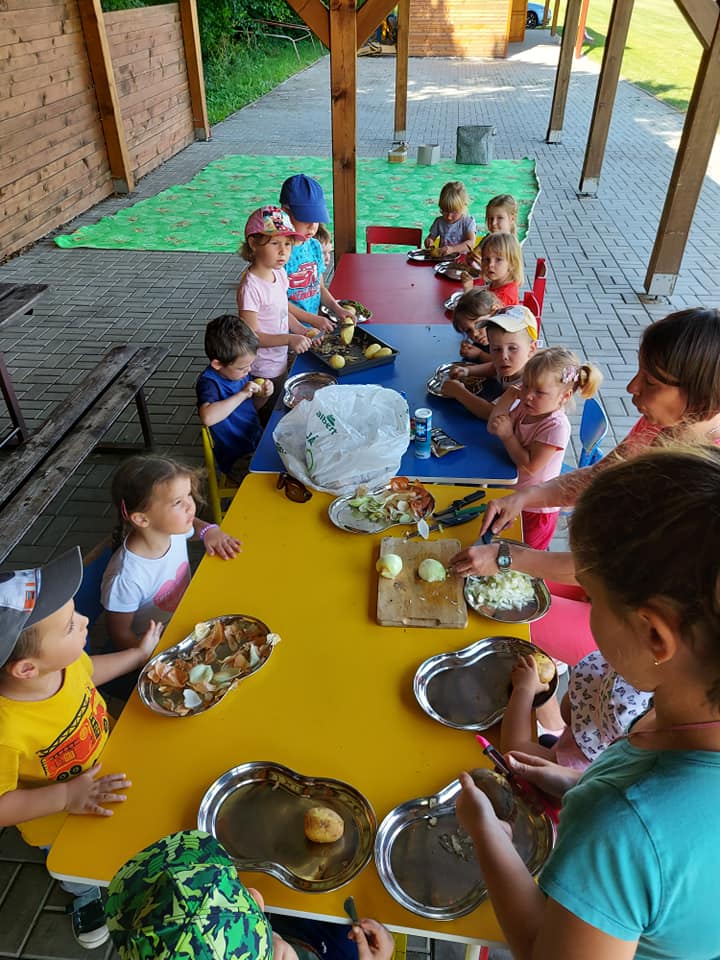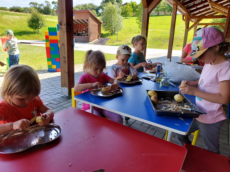 Červenec patřil naší školce v přírodě. S dětmi jsme se ráno sešli na obecním úřadě a pak už jsme pobývali až do zavíračky na obecním hřišti. Tam děti i svačily, obědvaly, spinkaly. Samozřejmě to by čas plný her a tvoření. Dle pravidel Ekoškoly si děti samy vybraly pokrm, který si závěrečný den chtějí připravit k obědu. Odhlasovaly si bramborový guláš, rozdělily si úkoly (suroviny, které mají donést a činnosti, kdo co bude dělat). Myslím, že se to moc povedlo. Důkazem byly prázdné talíře.
