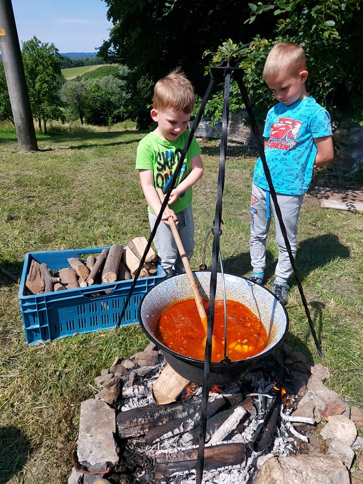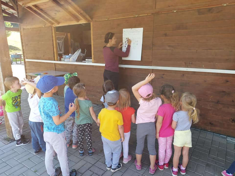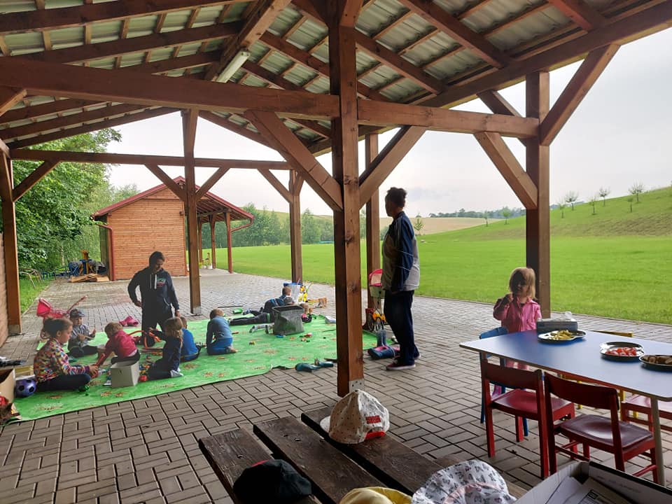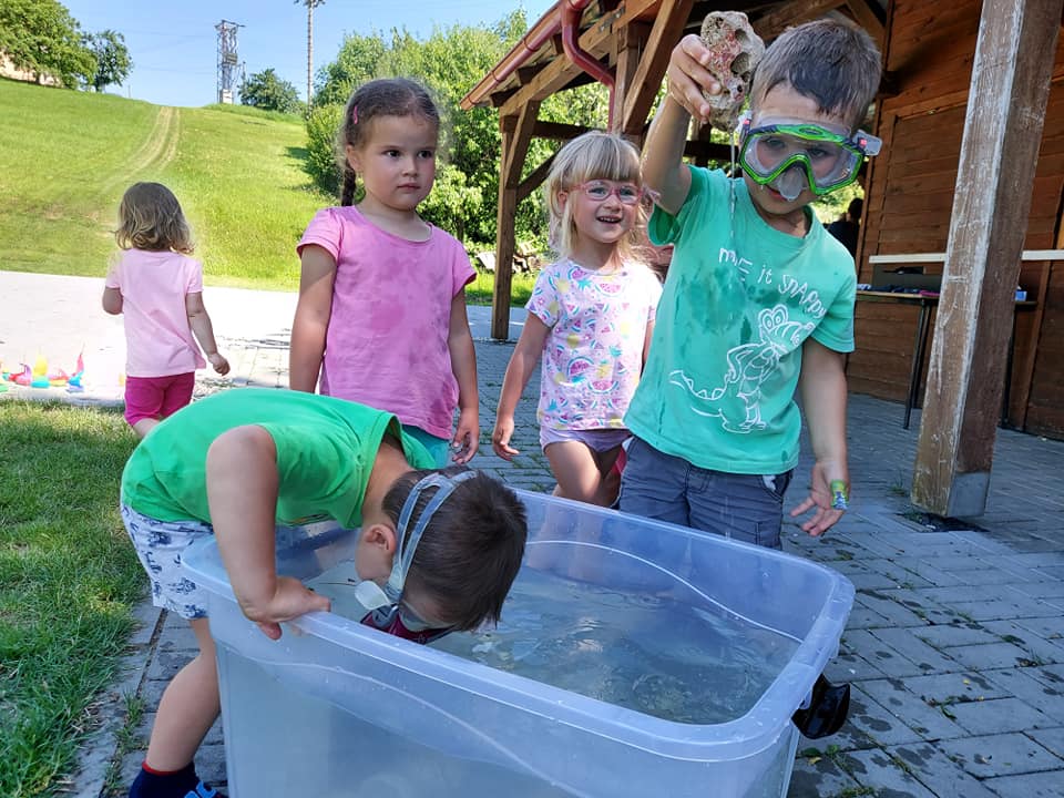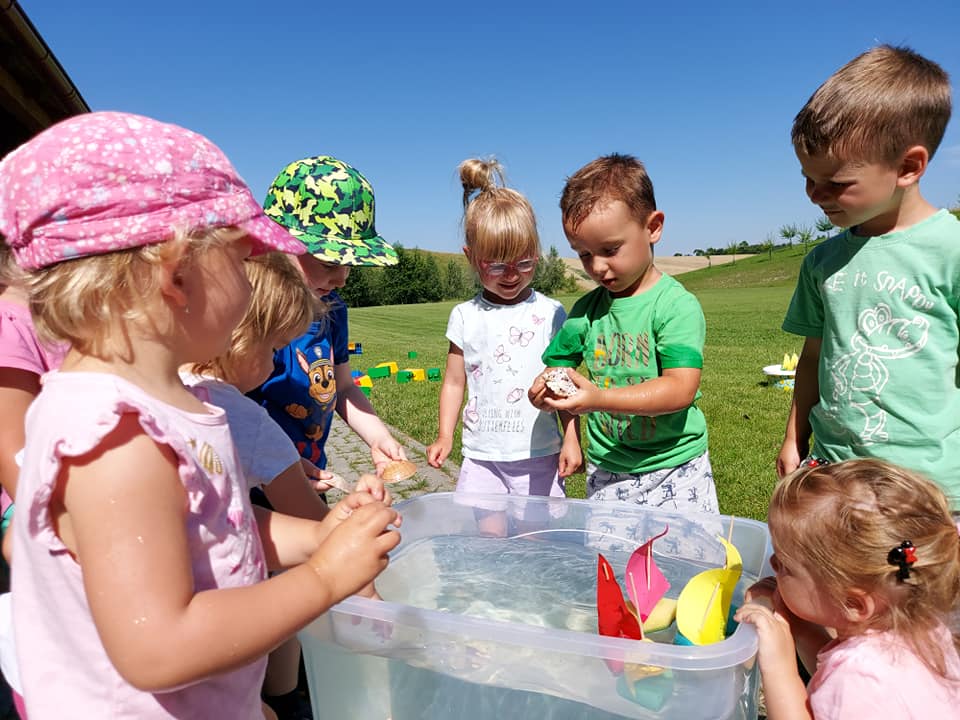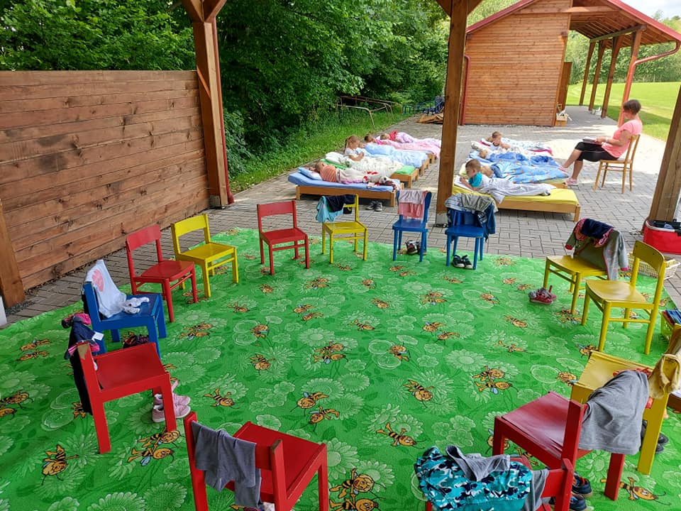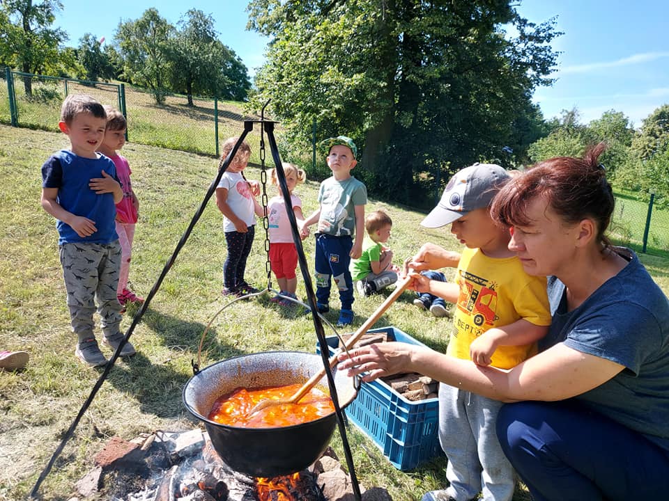 Červenec patřil naší školce v přírodě. S dětmi jsme se ráno sešli na obecním úřadě a pak už jsme pobývali až do zavíračky na obecním hřišti. Tam děti i svačily, obědvaly, spinkaly. Samozřejmě to by čas plný her a tvoření. Dle pravidel Ekoškoly si děti samy vybraly pokrm, který si závěrečný den chtějí připravit k obědu. Odhlasovaly si bramborový guláš, rozdělily si úkoly (suroviny, které mají donést a činnosti, kdo co bude dělat). Myslím, že se to moc povedlo. Důkazem byly prázdné talíře.
