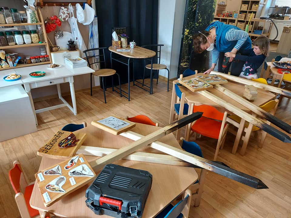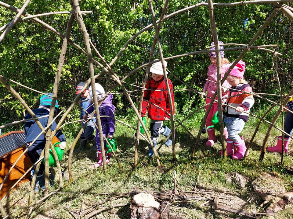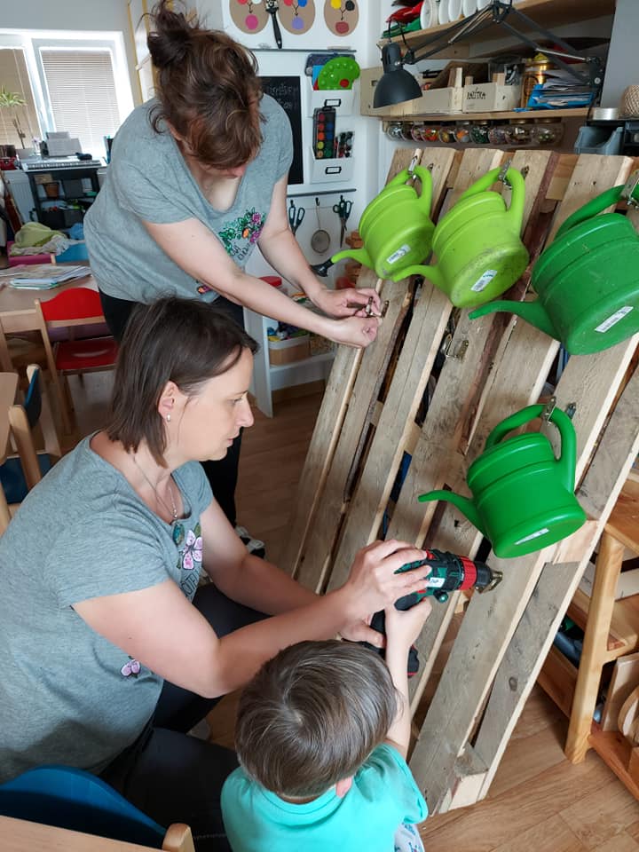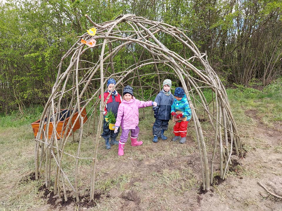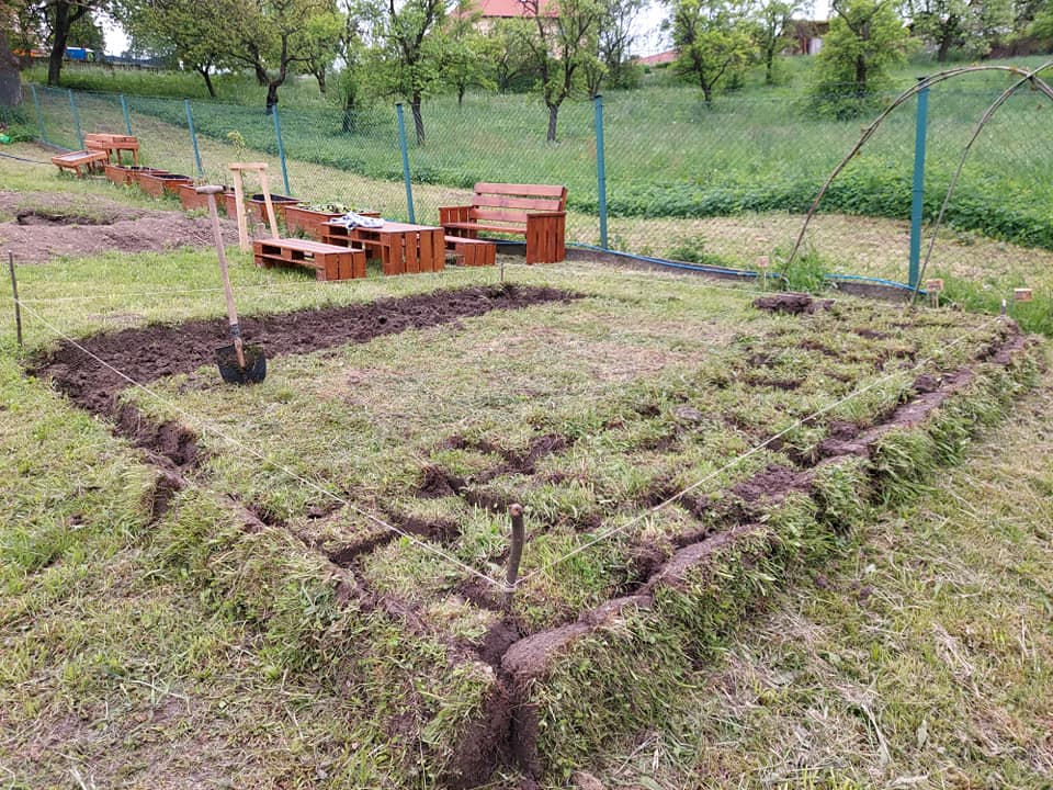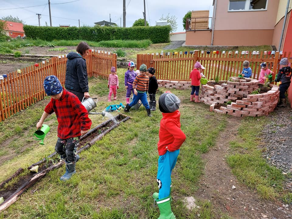 V květnu jsme se věnovali hlavně přírodní zahradě. Vyráběli jsme cedulky ke stromům a keřům, spoustu naučných cedulek a taky si děti vymysleli a vyrobili konvičkovník (držák na konvičky) Vybudovali jsme záhony na okrasné květiny a postavili bylinkovou spirálu. Zasadili jsme rajčata, papriky, dýně, okurky, hrášek, mrkev a spoustu bylinek. Mnoho z toho nám donesli rodiče dětí a snažili se aspoň nějak zapojit do budování přírodní zahrady, když do školky ještě kvůli covidovým opatření nesměli.
