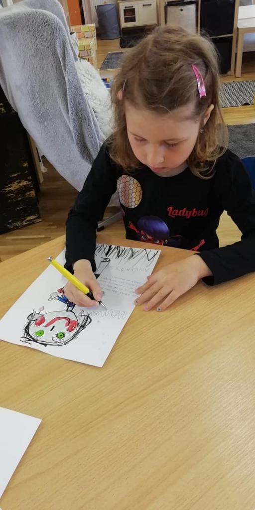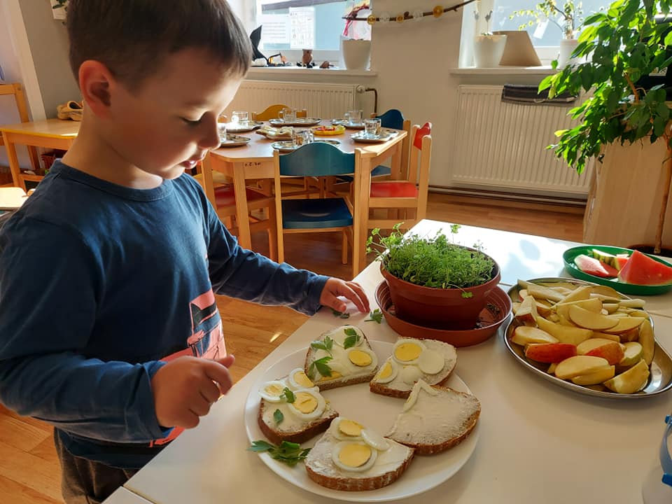 Kreslili jsme maminky ke Dni matek. Paní učitelka Eva nám ukázala, že už nyní je naše zahrada jedlá. Naučila nás poznávat některé opravdu chutné rostliny – plevele. Nasbírali jsme také spoustu pampeliškového kvítí a vyrobili z nich med a sirup.