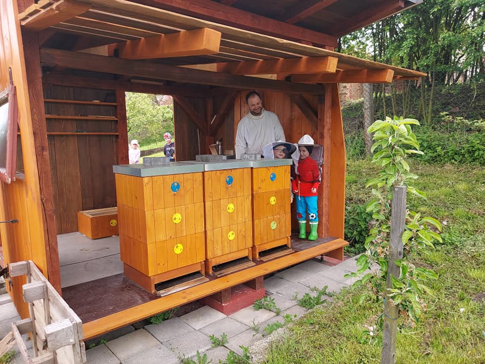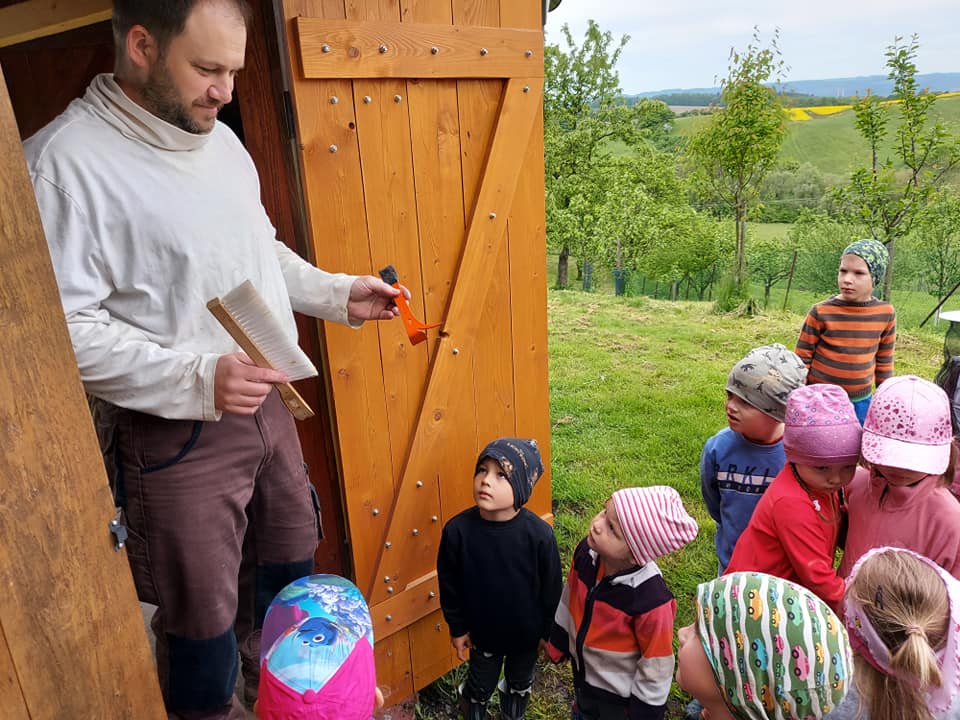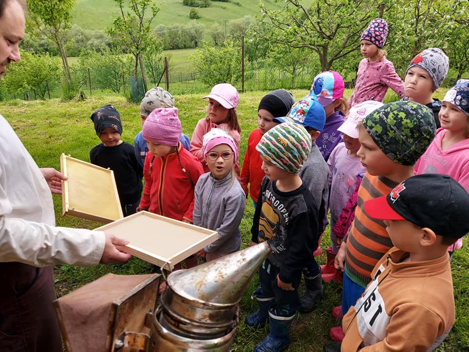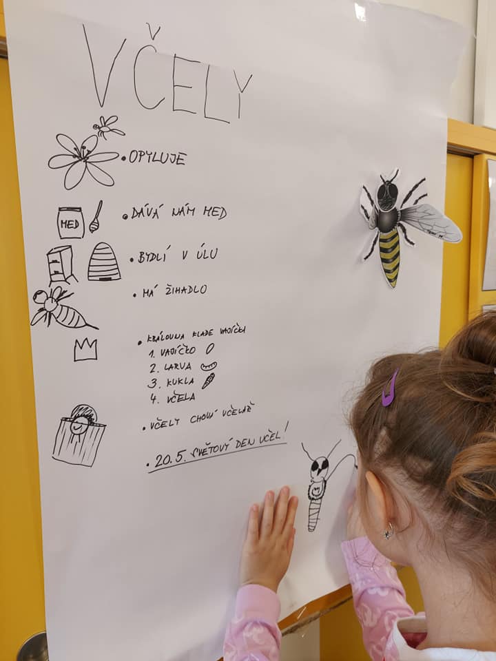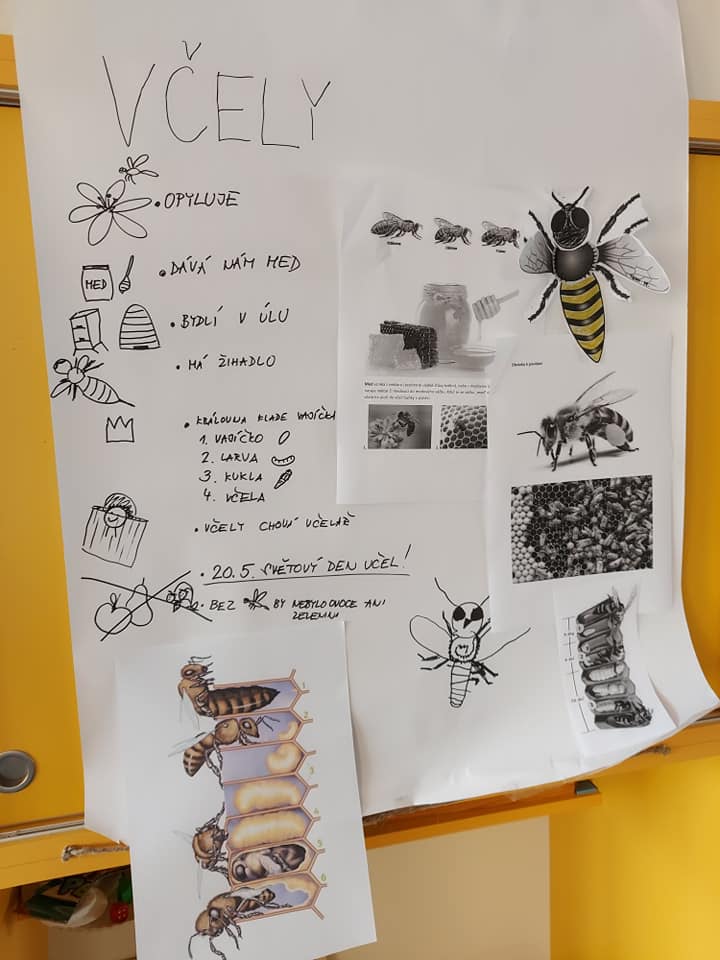 Věnovali jsme se velkému tématu Včely a 20.5. oslavili Světový den včel. Navštívili jsme pana Kundráta, špičkového včelaře, který nám ukázal svůj včelín, úly i pomůcky ke včelaření a na konci exkurze děti ještě odměnil medovými lízátky a obrázky.