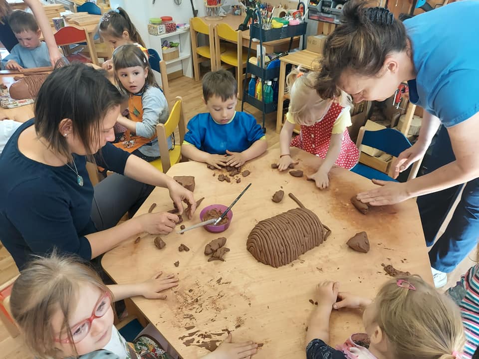 Připravovali jsme výtvarné práce na právě probíhající výstavu v Galerii M+M. Zapojili se i rodiče s dětmi, které na začátku května ještě nemohly chodit do školky.